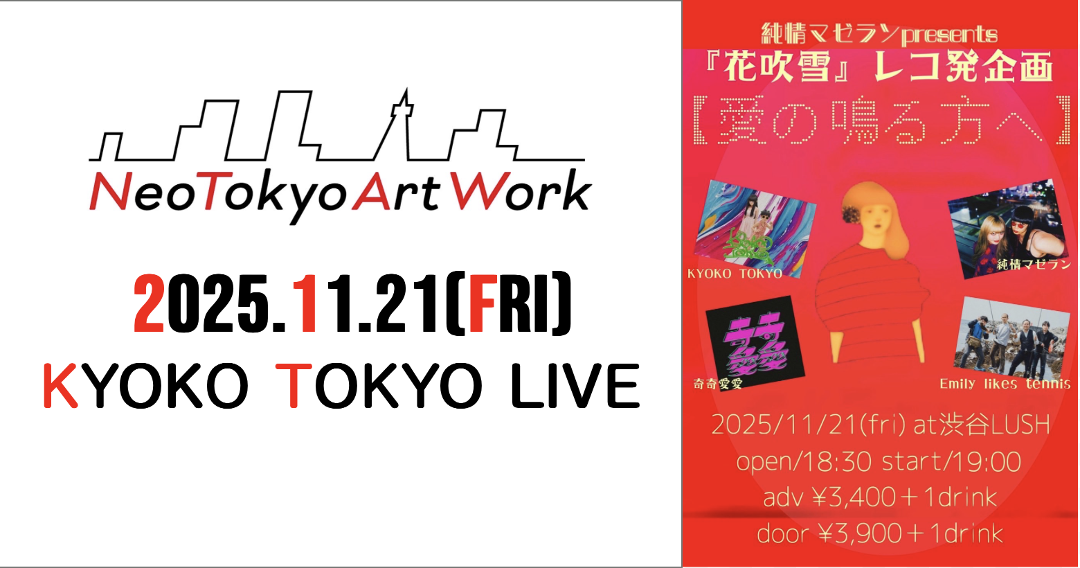 11/21(wed)KYOKO TOKYO live 2025.11.21 event純情マゼランpresents『花吹雪』レコ発企画【愛の鳴る方へ】place渋谷LUSHstart/open18:30/19:00ticketadv.¥2,900-/door.¥3,400-[+1drink]saleお問い合わせから取り置き可能other詳細…渋谷LUSH出演…w/純情マゼラン/奇奇愛愛/Emily likes tennis